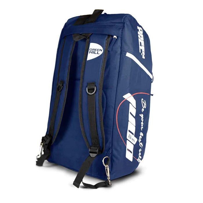 Bolsa de deporte utilizable en modo bolsa o modo mochila. En la parte trasera hay dos correas para los hombros que se pueden usar o guardar en el bolsillo especial con cremallera. Elección de color de negro, azul marino (oscuro). Gran compartimento principal de 50 cm x 25 cm con base de doble capa reforzada con acolchado de espuma firme; dos bolsillos laterales de 40 cm x 25 cm; dos bolsillos interiores para accesorios, uno de ellos con cremallera; asas con cierre de velcro; dos cierres de cinta de refuerzo en la parte superior, bandolera regulable y desmontable con hombrera de goma para facilitar el transporte; Refuerzo de espuma consistente para proteger los hombros del atleta en modo mochila.
